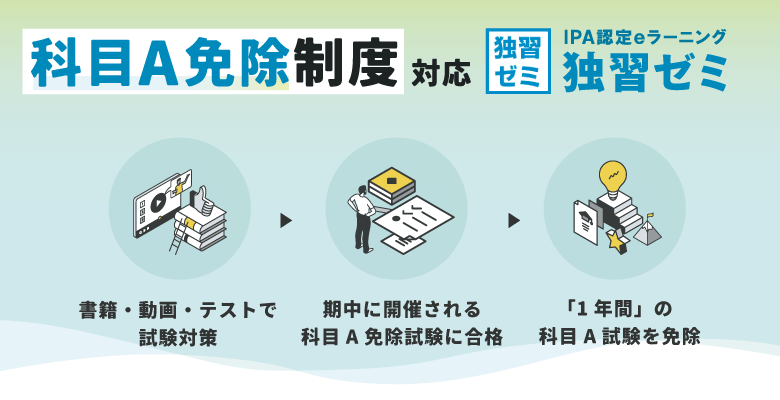 ・講座の内容 「科目A試験免除制度」に対応したIPA認定の基本情報技術者試験の対策eラーニング。 書籍・動画・WEBテストで対策を行い、期中の科目A免除試験に合格すれば、その後1年間の科目A試験を免除できます。 ・プログラムの流れ 1. eラーニング上で科目A試験対策を行い、学習条件をクリア 2. 6月/7月 または 12月/1月に開催される科目A免除試験に合格で1年間「科目A試験免除」 ・到達目標 科目A免除試験の合格 基本情報技術者試験 科目A試験合格相当の知識の習得 ・受講にあたっての注意事項 ※科目A免除制度とは 基本情報技術者試験の科目A分野を免除できる特別な制度です。独習ゼミ上で学習条件をクリアし、事前に「科目A免除試験」に合格すると、その後「1年間」科目A試験を免除することができます。1年以内であればいつでも科目B試験のみ受験となります。初めて受験される方や、効率良く合格を目指したい方などにおすすめです。 ※免除制度と試験の詳細はIPA(情報処理推進機構)のWebページをご参照ください。 https://www.ipa.go.
