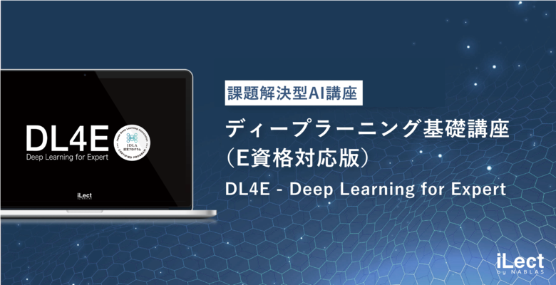 【DL4E|DeepLearning基礎理論講座(E資格対応) メンタリングつきeラーニングとは】 実績ある DL4E講座 を、より柔軟に学んでいただけるよう、 「eラーニング形式」 と 「メンタリング」 を組み合わせた新しい形でご提供いたします。 受講には iLect専用環境 「iLect System」 を使用し、講義動画を視聴しながら、お好きな時間・場所で学習を進めていただけます。 ご質問はいつでも iLect System 上で受け付けており、質問数に制限はありません。 さらに、Zoomを利用した ウェビナー形式の「メンタリング」 では、コンペティション形式の課題の解法共有や、メンターとの直接対話を通じたサポートを行います。 【DL4E講座とは?】 NABLAS社が運営する「iLect」が提供するDeep Learning技術の人材育成講座です。 本講座は、理論を基盤にDeep Learning技術を実践的に活用できる技術者の育成を目的としています。 修了時には、以下のスキル習得を目指します。 ・機械学習およびDeep Learningの主要技術