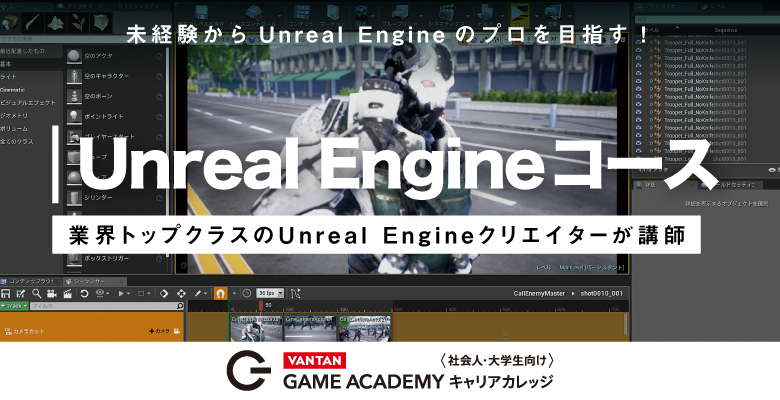 Unreal Engine 12か月コースでは、1年を通してエンジンの基本操作から高度なプログラミングまで、実務経験豊富な講師から直接指導を受けられます 。 最初に、エディタの基本操作やレベル構築、ライティングなどの基礎を学び、3D空間を構築する技術を定着させます。あわせて、生成型AIを活用した企画立案プロセスも習得し、自身が構築したいゲーム体験を明文化します 。 また、プレイヤーキャラクターの制御や、UMGを用いたUI設計を学び、視認性と操作性を両立させたフロントエンドの構築力を養います。さらにAI(ビヘイビアツリー)によるNPCの自律行動や、セーブ機能を通じたデータの永続化など、システムの中核となるバックエンドの仕組みを習得します 。 後半には、C++を用いた機能拡張やマルチプレイヤー通信、パフォーマンス最適化といった高度な領域に踏み込みます。プロファイラによる負荷分析やデバッグを実践し、快適なプレイ環境を実現する技術を磨きます 。 最終的に、これらの知識を統合した総合演習としてオリジナル作品の制作を行い、商用レベルを見据えた仕上げを通じて、現場で即戦力として通用するスキル