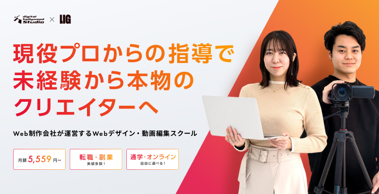 【講座の目的】 Web制作の現場で求められるスキル(デザイン・コーディング・マーケティング)、及び思考力の習得 【学習に利用するツール】 Illustrator・Photoshop・Figma・HTML・CSS・JavaScript・jQuery 【カリキュラムの特徴】 9万人以上のクリエイターを輩出するデジタルハリウッド社のカリキュラムに加え、数多くのデザインアワードを受賞してきたWeb制作会社LIGの特別授業やサポートを提供いたします。 【受講の流れ】 1.個別説明会の予約(無料) 2.個別説明会に参加 3.コースの受講申し込み 渋谷・新宿・横浜・千葉などデジタルハリウッドSTUDIOは全国に校舎があります。 ※ただし弊社LIGが運営する7校ではない場合、提供するサービスが異なりますのでご注意ください。 受講費用・入学金以外にその他設備費あり