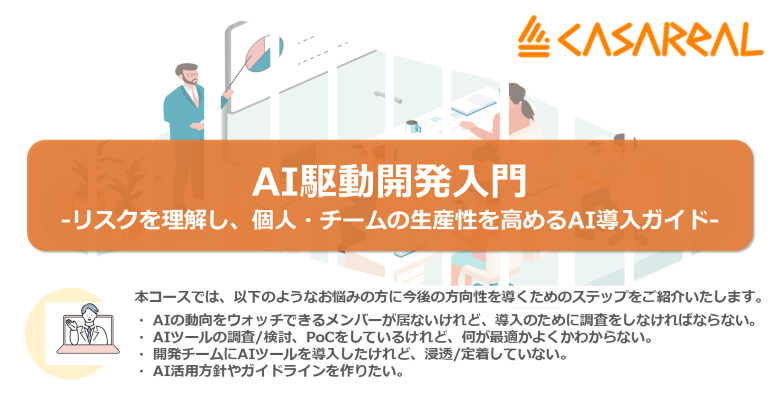 AIツール導入において、漠然とした不安感や難しさといった心理的な障壁を取り除き、 まずは個人レベルでのコーディングアシスト活用から生産性向上を目指し、 それがチーム全体への良い影響に繋がっていくための基礎知識を学習します。 本コースでは、以下のようなお悩みの方に今後の方向性を導くためのステップをご紹介いたします。 ・ AIの動向をウォッチできるメンバーが居ないけれど、導入のために調査をしなければならない。 ・ AIツールの調査/検討、PoCをしているけれど、何が最適かよくかわからない。 ・ 開発チームにAIツールを導入したけれど、浸透/定着していない。 ・ AI活用方針やガイドラインを作りたい。 <学習目標> ■ AIの動向を把握する ■ AIモデル/AIエージェントを理解する □ AI駆動開発におけるツール群、手法について理解する <カリキュラム> ■ AI開発最新の動向 □ AIエージェント活用の心構えとリスク理解 ■ AIを取り巻く現状とCAIO(Chief AI Officer)の重要性 □ 生成AIの急速な進化と