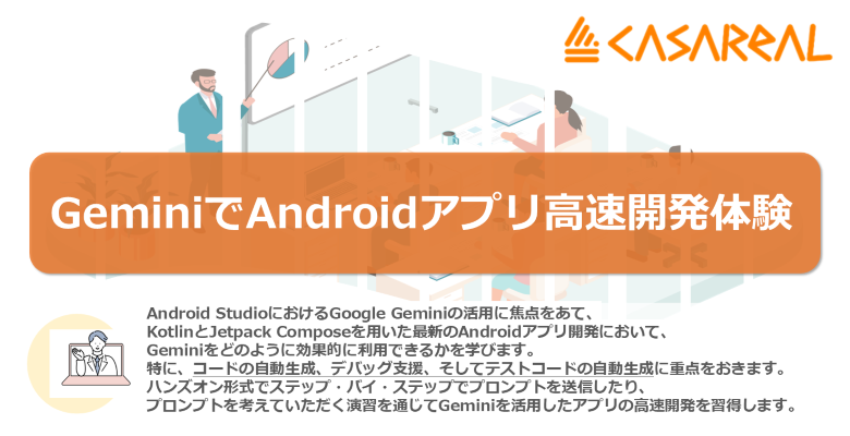 本研修では、Android StudioにおけるGoogle Geminiの活用に焦点を当て、KotlinとJetpack Composeを用いた最新のAndroidアプリ開発において、Geminiをどのように効果的に利用できるかを学びます。特に、コードの自動生成、デバッグ支援、そしてテストコードの自動生成に重点を置きます。ハンズオン形式でステップ・バイ・ステップでプロンプトを送信したり、ご自身でプロンプトを考えていただく演習を通じてGeminiを活用したアプリの高速開発を習得します。 <学習目標> ■ Geminiの概要と主な機能について説明できる ■ Android StudioでGeminiをセットアップする方法を説明できる ■ Geminiでャット機能やコード補完など、開発を支援する機能の利用方法を習得する ■ Geminiでアプリケーションコードやテストコードを生成する方法を習得する <カリキュラム> ■ Geminiの基礎とAndroid Studioの設定 ■ Geminiによるコード生成と開発支援 ■ Geminiを活用したテストコードの