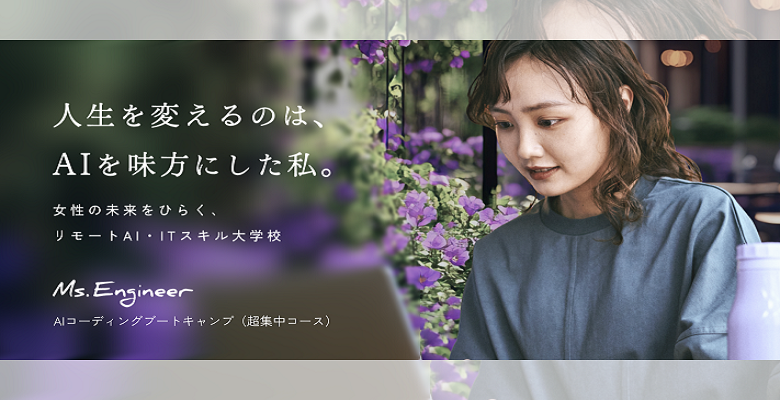 【「特に女性におすすめ」講座】 未経験からでも始められるプログラミング基礎学習と、即戦力のITエンジニアを目指せる実践的な学習を組み合わせた講座です。 学習に専念して最短で転職を目指したい方向けに6ヶ月以内の修了を目指します。 ■プログラミング基礎学習 - 自分のペースで学べるオンライン学習期間 - 定期的な授業で挫折しないで学べる環境 ■ITエンジニアを目指せる実践的な学習 - クラス形式で授業 - チーム開発演習で実践的なカリキュラム - AIワークフローやAI Agentを活用した最先端のAI開発総合演習 - エンジニア転職を支援するキャリアサポートプログラム ■Ms.Engineerの特徴 1. 女性のみの環境【満足度90%以上】 - アンコンシャス・バイアスを取り除き、心理的安全性の担保によって学習効果を高めます。 - 「質問がしやすい」、「女性ならではの悩み相談ができる」等の評価を得ています。 2. ライフスタイルに合わせて学べる環境 昼間の「全日コース」だけでなく、社会人が働きながら学べる「夜間コース」も実施されていま