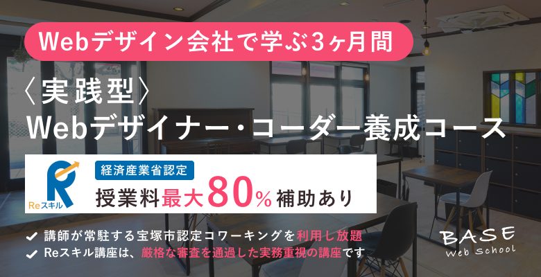 Web制作会社が運営する実務直結のスクールです。 Webデザインを初め、コーディング、マーケティング、UI/UXの知識まで、幅広く学べます。 <特徴> ・経済産業省指定第四次産業革命スキル習得講座認定講座 ・専門実践教育訓練給付金対象のため、受講料の50~80%還付(給付条件があります。) ・Web制作会社運営のため、実務に沿ったカリキュラム ・少人数で質問しやすい ・講師が常駐して質問もできるコワーキングが使い放題 ・卒業後も安心な制作パートナー制度 など <学習の流れ> 1. Webデザインの基本 デザインの基本原則から、実際に手を動かしながらのツール操作、バナーの制作を行います。 Webサイトに必要な基本知識やUI/UXデザインについても学びます。 2. コーディングの基礎・実践 HTML/CSSの書き方はもちろん、SEOの仕組みを理解しながら制作できるように学んでいきます。 3. オリジナルサイト制作 実案件等を題材にし、サイトの設計からデザイン、実装までを行います。 また、サイトの公開方法や、Web広告の知識も学び