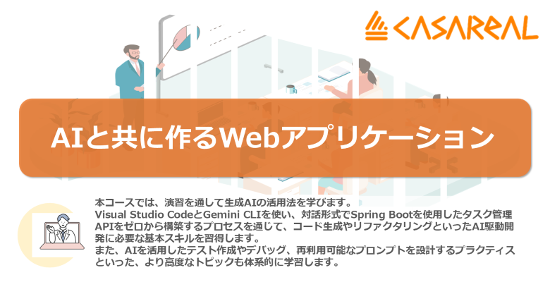 アプリケーション開発業務での利用を前提に、生成AIの基本概念、プロンプト作成にまつわる思考と操作方法、AIとの協業の仕組み化を見据えた観点までを体系的に学ぶことができます。 本コースでは、演習を通して生成AIの活用法を学びます。Visual Studio CodeとGemini CLIを使い、対話形式でSpring Bootを使用したタスク管理APIをゼロから構築するプロセスを通じて、コード生成やリファクタリングといったAI駆動開発に必要な基本スキルを習得します。また、AIを活用したテスト作成やデバッグ、再利用可能なプロンプトを設計するプラクティスといった、より高度なトピックも体系的に学習します。 <学習目標> ■ 生成AIの適切な活用方法と限界を理解する ■ AIを活用してコーディングとソフトウェアテストを効率的に実施できる ■ 生成AIの活用を前提とした開発時間の短縮技術を理解する <カリキュラム> ■ ソフトウェア開発における生成AIの特長と注意点 ■ AIを使ったWebアプリケーションの構築 ■ AIを使ったリファクタリングと高度なプロンプ